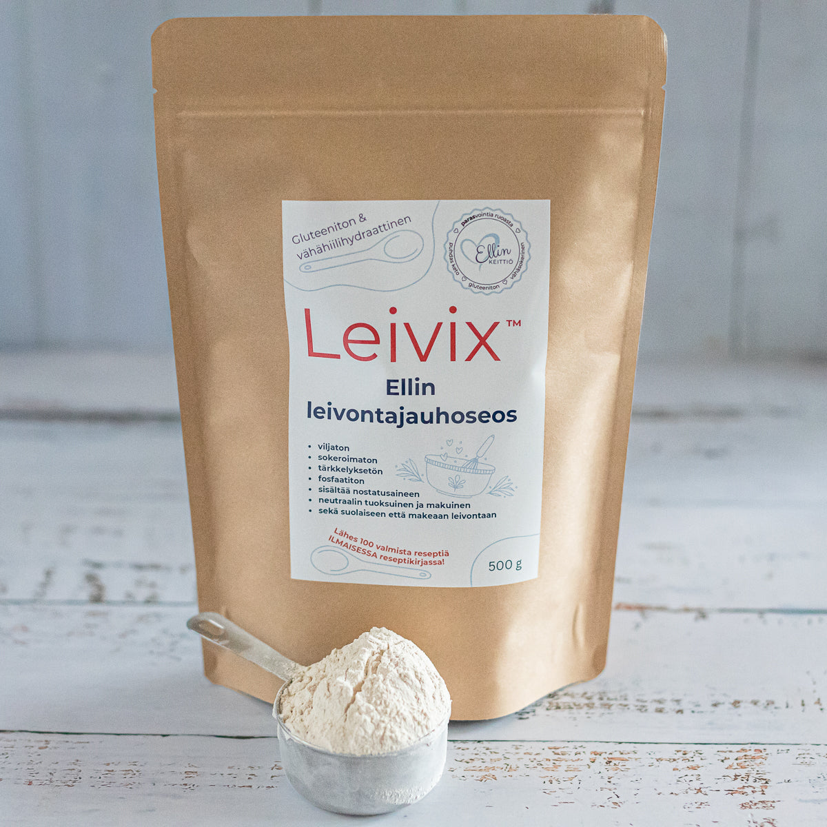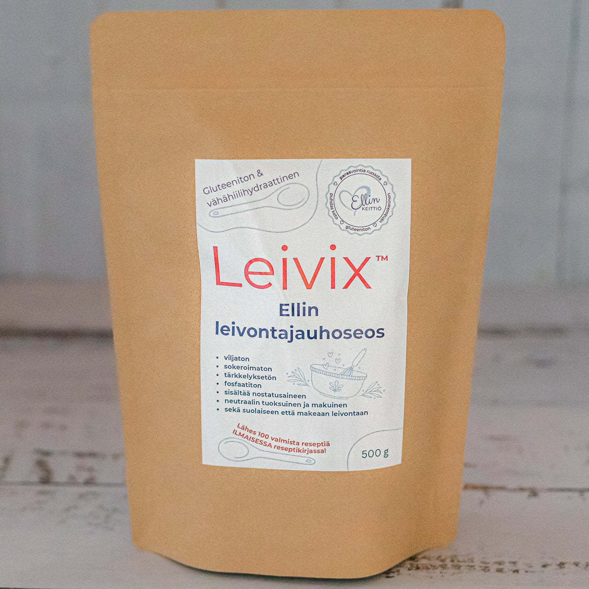 Kun Leivontamix poistui markkinoilta, sain valtavasti viestejä ja toiveita sen paluusta. Sen sijaan, että olisin vain kopioinut vanhan reseptini, päätin kehittää jotain vielä parempaa. Syntyi Leivix®, Ellin keittiön oma leivontajauhoseos — ja jolle rekisteröin jopa tavaramerkin.