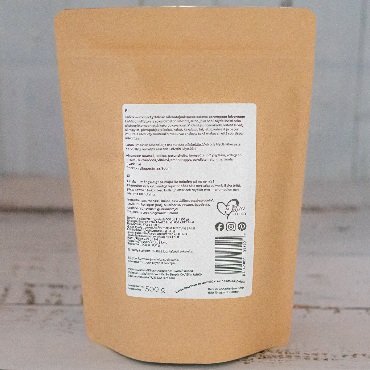 Mukana on myös ripaus merisuolaa, joka korostaa makuja juuri sopivasti. Lopputulos on jauhoseos, joka toimii sekä makeissa että suolaisissa resepteissä ilman, että jauhon maku tai tuoksu puskee läpi. Leivix® pysyy neutraalina ja antaa itse reseptin loistaa.